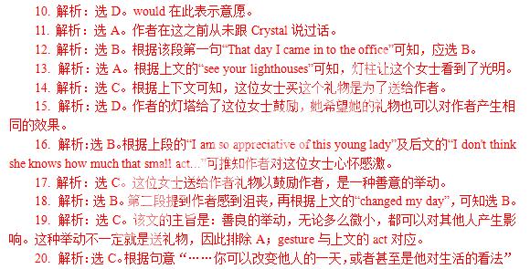 9. 解析:选B。由文意可知,作者不清楚Crystal为什么突然送自己礼物,因此感到很“迷惑”。