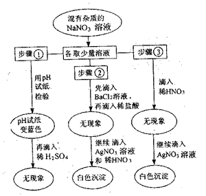 实验时,有同学不小心放错了胶头滴管,使得NaNO3溶液的试剂瓶中可能混入NaCl、NaOH、Na2CO3和 Na2SO4中的一种或几种。为了验证,他进行了如右图所示的实验。