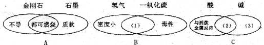 下图A是一种用于显示事物异同点的信息处理方法。两个椭圆分别代表金刚石和石墨的有关信息,两椭圆重叠的区域表示金刚石和石墨的共同特征,重叠区域以外的部分表示它们的独有特征。请你在下面的空格内填写与图B、图C中(1)、(2)、(3)区域对应的适当内容(每处只要求填一点)。![]()