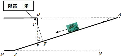 如图,是停车库坡道入口的设计图,其中MN是水平线,MN∥AD,AD⊥DE,CF⊥AB,垂足分别为D、F,坡道AB的坡度i=1:3,AD=9米,C在DE上,DC=0.5米,CD是限高标志牌的高度(标志牌上写有:限高_____米).如果进入该车库车辆的高度不能超过线段CF的长,计算该停车库限高多少米.(结果精确到0.1米)