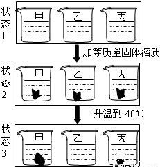 (3)40℃时,烧杯 (填甲、乙或丙)里的溶液中溶剂的质量最少.