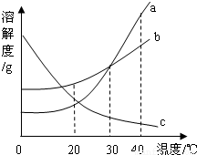 20℃时,取相同质量的a、b、c三种物质的饱和溶液分别置于三个烧杯中,再分别向其中加入相同质量的相应固体溶质,将温度升高到40℃,固体的溶解情况如图1所示.图2为a、b、c三种物质的溶解度曲线.请仔细阅读图1和图2回答下列问题:
