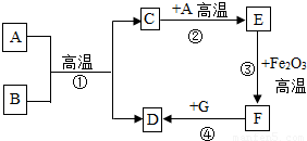 摘要:26.A-G都是初中化学中常见的物质.已知:B为黑色固体,C是常用于灭火的气体,A与C是组成元素相同的两种氧化物,D为红色固体单质,E为黑色固体单质,F为一种比较活泼的常见金属,G是一种蓝色溶液.它们的转化关系如图所示: 试推断: ⑴物质B的化学式 , ⑵反应③的化学方程式 , ⑶反应④的化学方程式 .反应类型: 反应.