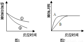 小红和小明进行盐酸与锌反应制取氢气的实验研究.小红用较稀的盐酸,小明用较浓的盐酸.他们分别取等质量的锌粒与等质量盐酸在烧杯中反应,(假设盐酸均足量)并将烧杯中物质总质量随反应时间的变化情况绘制成图1.