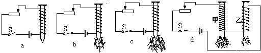 为了检验上述猜想是否正确,小丽所在实验小组通过交流与合作设计了以下实验方案用漆包线(表面涂有绝缘漆的导线)在大铁钉上绕制若干圈,制成简单的电磁铁.图所示的a、b、c、d为实验中观察到的四种情况.