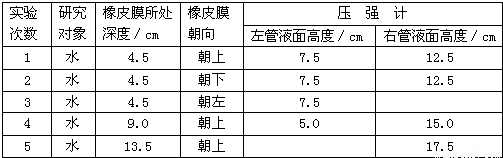.| 实验 | 液体类型 | 橡皮膜所处深度/cm | 橡皮膜朝向 | 压强计左右水面高度/cm |