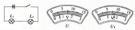 (9分)如图所示,用电压表分别测量L1两端的电压U1、L2两端的电压U2以及L1、L2串联的总电压U,请根据表盘读数回答下列问题: ⑴L1两端的电压U1是多大? ⑵L2两端的电压U2是多大?⑶L1、L2串联的总电压U是多大?