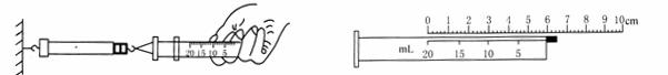 ⑵如图所示,用细尼龙绳拴住注射器活塞的颈部,使绳的另一端与弹簧测力计的挂钩相连,然后水平向右慢慢拉动注射器筒。当注射器中的活塞刚被拉动时,记下弹簧测力计的示数为29.9N。![]()