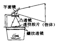 投影仪是教学中常用的仪器,如图10所示是投影仪的结构图,在水平放置的凸透镜的正上方有一与水平面成450角的平面镜,右边竖直放一屏幕,物体发出的光线经过凸透镜和平面镜后,可在屏上成一清晰的像。一教师在使用投影仪时,发现在屏幕上画面太小,正确的调节方法是〔 〕![]()