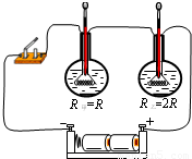 如图所示是“探究电流通过导体产生热量与导体电阻关系”的实验装置,两阻值分别为R和2R的电阻丝浸在相同质量和相同初温的煤油中,每一烧瓶里各插一支温度计,则闭合开关,经过一段时间,两电阻丝产生热量的多少是通过 反映出来的;采用这种连接方式的目的是 .