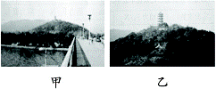 小明站在同一位置用数码相机(焦距可改变)对着无锡著名景点——锡山先后拍摄了两张照片甲和乙,如图所示。他产生了这样的疑问:物体通过凸透镜在光屏上所成像的大小与透镜的焦距有何关系呢?小明对此进行了探究。(4分)