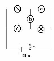 摘要:如图8所示电路中.a.b.c是三个电表.且连接没有错误.两个电灯L1.L2均正常发光.已知a.b.c三个电表的读数的数字为1.5.1.2和2.5.则通过灯L2的电流是( ) A. 1.5安 B. 0.3安 C. 1安 D. 1.2安