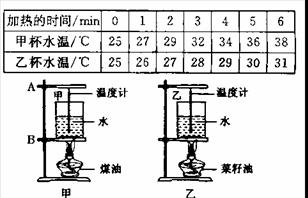 某同学学习了燃料的热值后,自己设计了一个实验来探究煤油和菜籽油的热值大小关系。他实验时组装了如图所示的两套规格完全相同的装置,并每隔1分钟记录了杯中水的温度(见下表)。