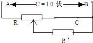如图所示电路中,滑动变阻器R的最在阻值为100欧姆,负载电阻R′的阻值为100欧姆,AB间电压为10伏特,保持不变,当滑动头P左右移动时,R′两端的电压范围应是 ;若C点导线折断,则R′两端的电压范围是 .