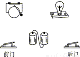 在学校传达室安装一个电铃、一个电池组和两个电灯,并在前后门各装一个开关.要求:前门来人按下开关电铃响,电灯L1亮,后门来人按下开关电铃响,电灯L2亮。请在方框中设计一个电路,并按设计连接图中对应的实物图.