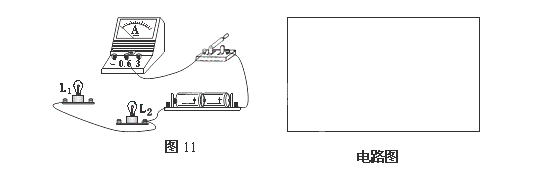 小明同学做“用电流表测电流”实验的电路如图11所示,请用笔线代替导线将电路连接完整,使灯L1和L2并联连接,电流表测量通过灯L1电流(用铅笔在试卷的相应位置上作图)并画出电路图。为研究并联电路中的电流关系,他还应继续测量通过________和_______的电流,然后归纳得出结论.