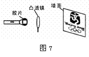 8.小明自制了一个简易投影仪,在暗室中将印有奥运五环标志的透明胶片,贴在发白光的手电筒上,并正对着焦距为f的凸透镜.调整手电筒、凸透镜、白色墙壁之间的位置,在墙上得到了一个如图7所示的像,胶片与凸透镜的距离应该在_____________范围(选填