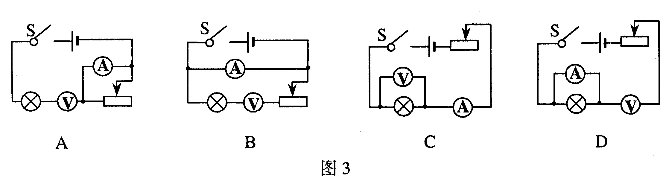 如图3所示,当开关S闭合后,可能会造成电流表或电压表损坏的是( )