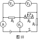 查看习题详情和答案>>如图10所示的电路中,电源两端电压为U且保持不变,定值电阻R1与R3的阻值不随温度变化。闭合开关S,将滑动变阻器的滑片P 分别置于a点和b点,电压表V1、V2和 V3示数变化量的绝对值分别为ΔU1、ΔU2和ΔU3,电阻R1、R2、R3电功率变化量的绝对值分别为ΔP1、ΔP2和ΔP3,滑动变阻器的滑片P在a、b两点时电流表的示数分别为Ia 和 Ib。对于电路发生的上述变化过程,下列说法中正确的是
