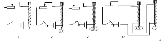 用漆包线(表面涂有绝缘漆的导线)在大铁钉上缠绕若干圈,制成简单的电磁铁.图12所示的a,b,c,d为实验中观察到的四种情况.