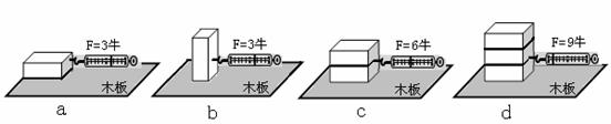 为了探究影响滑动摩擦力大小的因素,小明和小红二位同学利用若干个完全相同的长方体(重10牛)、弹簧测力计、水平放置的木板(粗糙程度相同)进行实验。实验中,他们先后以平放、竖放的方式改变长方体与木板之间的接触面积,如图(a)、(b)所示;然后将几块长方体叠放在一起进行实验,如图(c)、(d)所示。实验过程中始终用同一弹簧测力计拉动长方体做匀速直线运动。