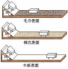 为了探究运动和力的关系,小敏进行了如下实验:在水平放置的木板上铺上粗糙程度不同的毛巾,棉布,让同一辆小车由同一斜面上,分别从A、B、C处静止开始滑下,观察小车在不同水平面上运动的距离,记录在表中,实验重复三次。