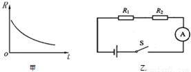 (2)小明想利用热敏电阻制成温度报警器.实验室中现有两只外形完全相同的电阻R1和R2,其中一只为热敏电阻,另一只为定值电阻(阻值不随温度的变化而变化).为了辨别它们,小明设计了如图乙所示的电路.