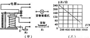 小明设计了一种“自动限重器”,如图(甲)所示.该装置由控制电路和工作电路组成,其主要元件有电磁继电器、货物装载机(实质是电动机)、压敏电阻R1和滑动变阻器R2等.压敏电阻R1的阻值随压力F变化的关系如图(乙)所示.当货架承受的压力达到限定值,电磁继电器会自动控制货物装载机停止向货架上摆放物品.已知控制电路的电源电压U=6V,电磁继电器线圈的阻值忽略不计.请你解答下列问题: