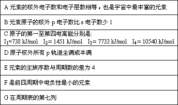 (1)A元素位于元素周期表第 周期 族,B元素和C元素的第一电离能比较,较大的是 ,C元素和F元素的电负性比较,较小的是 。