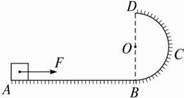 (11分)如图所示,水平地面AB=10m.BCD是半径为R=0.9m的光滑半圆轨道,O是圆心,DOB在同一竖直线上.一个质量m=1.0kg的物体静止在A点.现用F=10N的水平恒力作用在物体上,使物体从静止开始做匀加速直线运动.物体与水平地面间的动摩擦因数μ=0.5.当物体运动到B点时撤去F,以后物体沿BCD轨道运动,离开最高点D后落到地上的P点(图中未画出).g取10 m/s2.求: