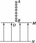 如图所示,M、N是水平放置的一对正对平行金属板,其中M板中央有一小孔O,板间存在竖直向上的匀强电场,AB是一根长为9L的轻质绝缘细杆,在杆上等间距地固定着10个完全相同的带电小球,每个小球带电荷量为q,质量为m,相邻小球间的距离为L。现将最下端的小球置于O处,然后将AB由静止释放,AB在运动过程中始终保持竖直,经观察发现,在第四个小球进入电场到第五个小球进入电场前这一过程中,AB做匀速直线运动,求: