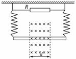 如图所示,两根相同的劲度系数为k的金属轻弹簧用两根等长的绝缘线悬挂在水平天花板上,弹簧的上端通过导线与阻值为R的电阻相连,弹簧的下端接一质量为m、长度为L、电阻为r的金属棒,金属棒始终处于宽度为d的垂直纸面向里磁感应强度为B的匀强磁场中。开始时弹簧处于原长,金属棒从静止释放,其水平下降高度为h时达到了最大速度。已知弹簧始终在弹性限度内,且当弹簧的形变量为x时,它的弹性势能为kx2/2,不计空气阻力和其他电阻。求