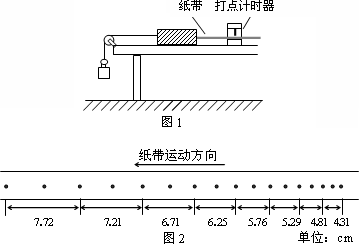 实验装置如图1所示:一木块放在水平长木板上,左侧栓有一细软线,跨过固定在木板边缘的滑轮与一重物相连。木块右侧与打点计时器的纸带相连。在重物牵引下,木块在木板上向左运动,重物落地后,木块继续向左做匀减速运动,图2给出了重物落地后,打点计时器在纸带上打出的一些点,试根据给出的数据,求木块与木板间的摩擦因数μ。要求写出主要的运算过程。结果保留2位有效数字。(打点计时器所用交流电频率为50 Hz,不计纸带与木块间的拉力。取重力加速度g=10 m/s2)