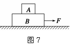 光滑水平地面上叠放着两个物体A和B,如图7所示.水平拉力F作用在物体B上,使A、B两物体从静止出发一起运动.经过时间t,撤去拉力F,再经过时间t,物体A、B的动能分别设为EA和EB,在运动过程中A、B始终保持相对静止.以下有几个说法: