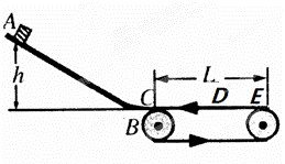 如图所示,质量m=lkg的物块从h=0.8m高处沿光滑斜面滑下,到达底部时通过光滑圆弧BC滑至水平传送带CE上,CE长L=3m.D是CE之间的一点,距离C点2m。传送带在皮带轮带动下,以v=4m/s的速度逆时针传动,物块与传送带间动摩擦因数μ=0.3,求:![]()