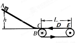 如图所示,质量m=lkg的物块从h=0.8m高处沿光滑斜面滑下,到达底部时通过光滑圆弧BC滑至水平传送带CE上,CE长L=3m.D是CE之间的一点,距离C点2m。传送带在皮带轮带动下,以v=4m/s的速度逆时针传动,物块与传送带间动摩擦因数μ=0.3,求: