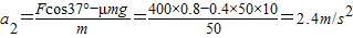 在水平方向由牛顿第二定律:Fcos37°-μmg=ma2 ③