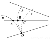 如图6-2-22所示,为某一点电荷所形成的一簇电场线,a\,b\,c三条虚线为三个带电粒子以相同的速度从O点射入电场的运动轨迹,其中b虚线为一圆弧,AB的长度等于BC的长度,且三个粒子的电荷量大小相等,不计粒子重力,则以下说法正确的是 ( ).