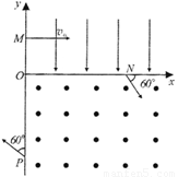 (17分)平面直角坐标系中,第1象限存在沿轴负方向的匀强电场,第Ⅳ象限存在垂直于坐标平面向外的匀强磁场,磁感应强度大小为B。一质量为m、电荷量为q的带正电的粒子从y轴正半轴上的M点以速度垂直于轴射入电场,经轴上的N点与轴正方向成60º角射入磁场,最后从轴负半轴上的P点与轴正方向成60º角射出磁场,如图所示。不计粒子重力,求: