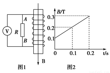 (12分)如图(1)所示 ,线圈匝数n=200匝,直径d1=40cm,电阻r=2Ω,线圈与阻值R=6Ω的电阻相连.在线圈的中心有一个直径d2=20cm的有界圆形匀强磁场,磁感应强度按图(2)所示规律变化,试求:(保留两位有效数字)
