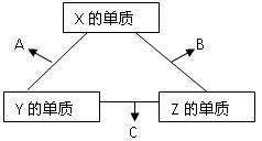 (10分)X、Y、Z三种短周期元素,它们的原子序数之和为16 。X、Y、Z三种元素常见单质在常温下都是无色气体,在适当条件下可发生如下图所示变化:![]()