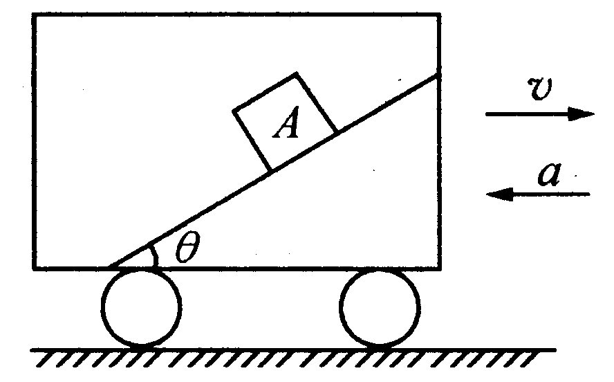如图所示,以50米/秒的速度行驶的实验汽车,在开始刹车后5秒钟内完全停下来,车上固定一个光滑斜面,斜面背向前进方向.在刹车过程中斜面上的物体A恰与斜面无相对运动,则斜面的倾角应为多少?