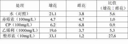 丝瓜为雌雄同株异花植物,将刚萌动的该植物种子先在一定浓度的5种不同溶液中浸泡24h,然后种植。比较最初10节的雌花与雄花平均数,算出性别比。实验及观察结果如下表。下列各项叙述中,正确的是