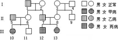 (3)我国婚姻法禁止近亲结婚,若Ⅲ-11与Ⅲ-13婚配,则其孩子中患甲病的概率是_________,患乙病的概率是_________,只患一种病的概率为 ______ ,生一个正常孩子的概率是_________。
