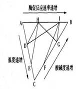 查看习题详情和答案>>如图为不同因素与酶促反应速率的关系图,A→B代表酶促反应速率坐标(0~100%),A→C代表温度坐标(0~70℃),C→B代表溶液酸碱度坐标(pH=0.1~14),下列叙述中不正确的是 (各线段含义提示:例如EH线段表示温度为E时,该酶的酶促反应速率为H)