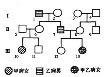 查看习题详情和答案>>右图所示遗传系谱中有甲(基因设为D、d)、乙(基因设为E、e)两种遗传病,其中一种为红绿色盲症。下列有关叙述中不正确的是![]()