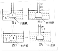下图表示渗透作用装置图,其中半透膜为膀胱膜,装置溶液A.B.a.b浓度分别用MA.MB.Ma.Mb表示,已知MA>MB,Ma=Mb> MA。若图1.图3液面上升且图2.图4分别表示一段时间后的相应图像, 则达到平衡后 .