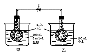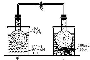 如图所示,烧瓶A、B中装有相同浓度的NO2和N2O4的混合气体,中间用止水夹K夹紧,烧杯甲中盛放100 mL 6 mol/L的HCl溶液,烧杯乙中盛放100mL冷水。现向烧杯甲的溶液中放入25g NaOH固体,同时向烧杯乙中放入25 g NH4NO3固体,搅拌使之溶解。