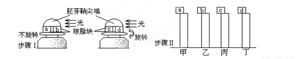 摘要:59.下图表示有关生长素的一项实验: (1)此实验研究的课题是: . (2)实验步骤I中旋转琼脂块和胚芽鞘尖端的目的是 .如果不采用旋转的方法.还可以用什么方法来研究? . (3)根据所学知识作出预测.经过一段时间后.图中甲.乙.丙.丁四个切去尖端的胚芽鞘中弯曲程度最大的是 .最小的是 . 答案 1-5DDACA 6-10BCBBC 11-15CCCDC 16-20ACDAC 21-25CBDCD 26-30CCDDD 31-35CDBCA 36-40CCAAA 41-45DABDC 46-50CDCAB 51-53CBD