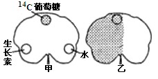 (7-8班同学做)某学者曾做过如图甲所示的实验,即在天竺葵的同一叶片的不同部位分别滴加一定浓度生长素溶液、水和14C-葡萄糖,待充分作用后,得到如下图乙所示的结果,其阴影部分表示具有放射性。下列结论正确的有几项( )